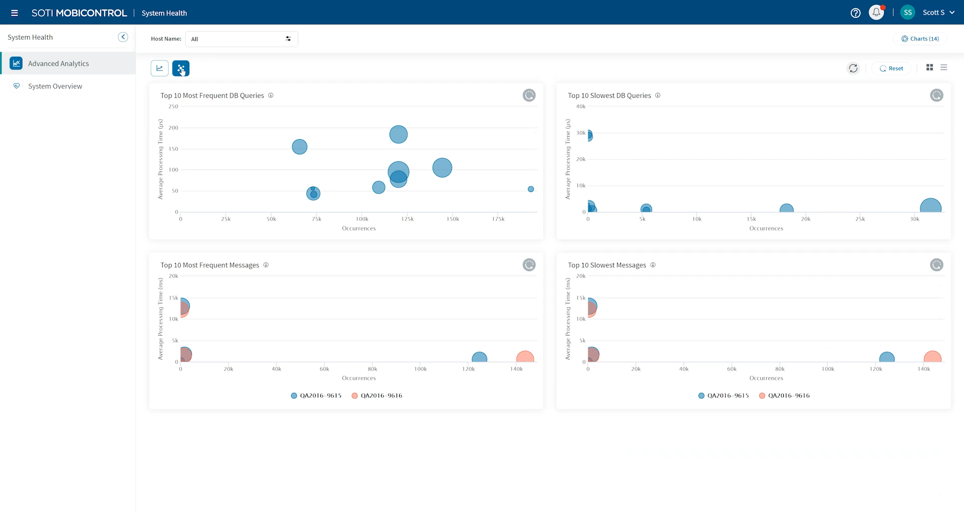 The SOTI MobiControl System Health Dashboard1 gives you a comprehensive overview of the operational performance of SOTI MobiControl in a variety of metrics: