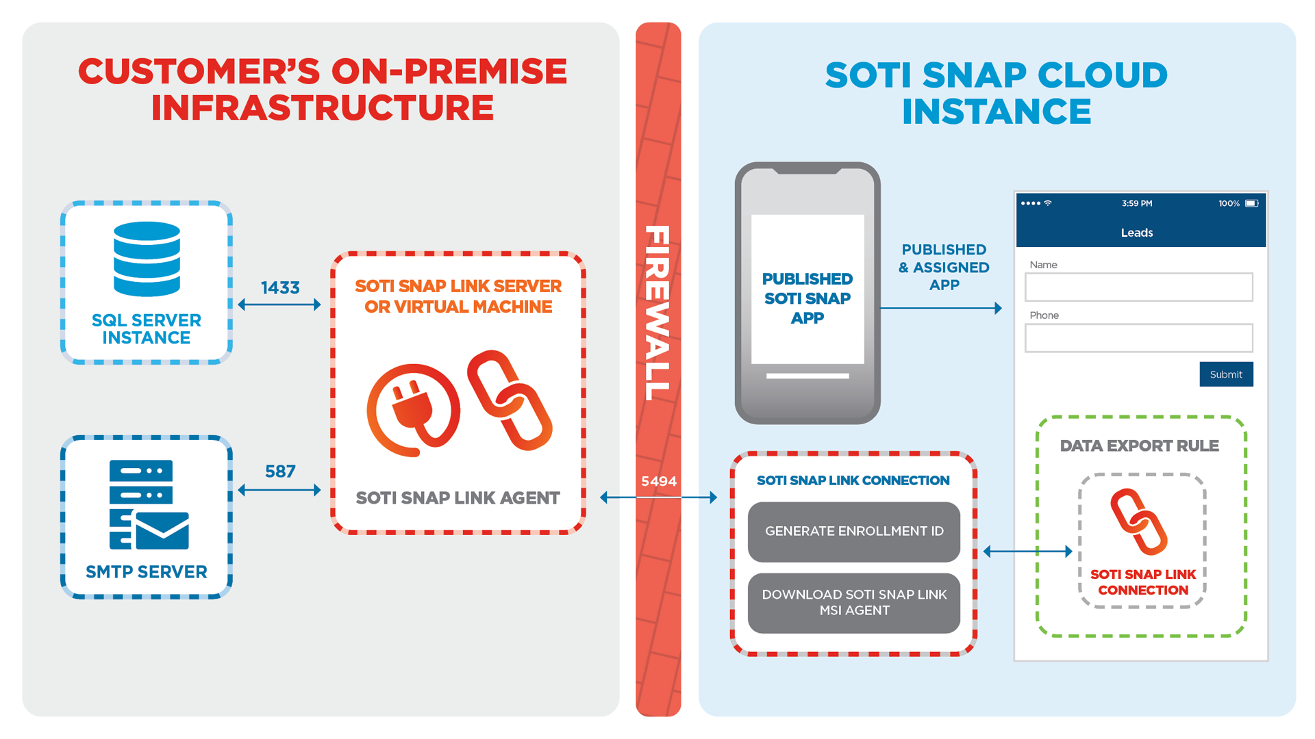SOTI Snap Link addresses this issue by establishing a secure outbound connection to the SOTI Snap server which can then be utilized by different SOTI Snap apps to export data.