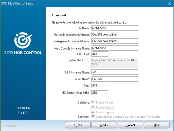 Site Name The automatically configured site name of the SOTI MobiControl deployment. Device Management Address The automatically configured address that Android and Apple devices use for connectivity. The address must be in either FQDN or IP format. Management Service Address The automatically configured address of the SOTI MobiControl Management Service. This address must be in FQDN format. Web Console Instance Name Enter a name for your SOTI MobiControl console instance. Note: If left blank, the System Root URL will be generated based on the Device Management Address.HTTPS Port Enter the port number of the HTTPS connection. System Root URL Displays the system root URL. SSP Instance Name Enter a name for your Self Service Portal instance. Server Name Enter a name for your deployment server. Port Enter a port number for the connection to the deployment server. MC Search Heap (MB) Enter the amount of memory in megabytes you want to be allocated for SOTI MobiControl searches. Database: Create Partition When enabled, the database is divided into 14 partitions to optimize data collection. See Database Partitioning for more information.