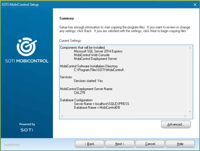 Modify the advanced settings for SOTI MobiControl. Click Next to begin the installation or Back to return to a previous wizard panel.